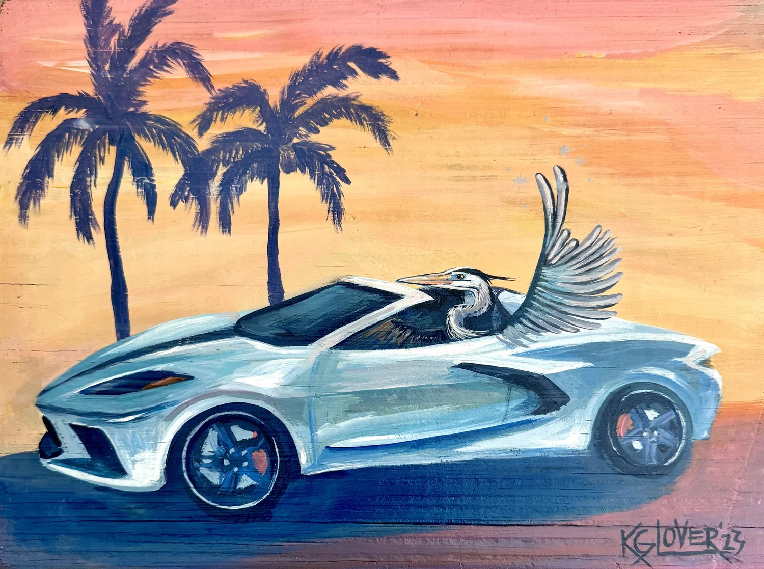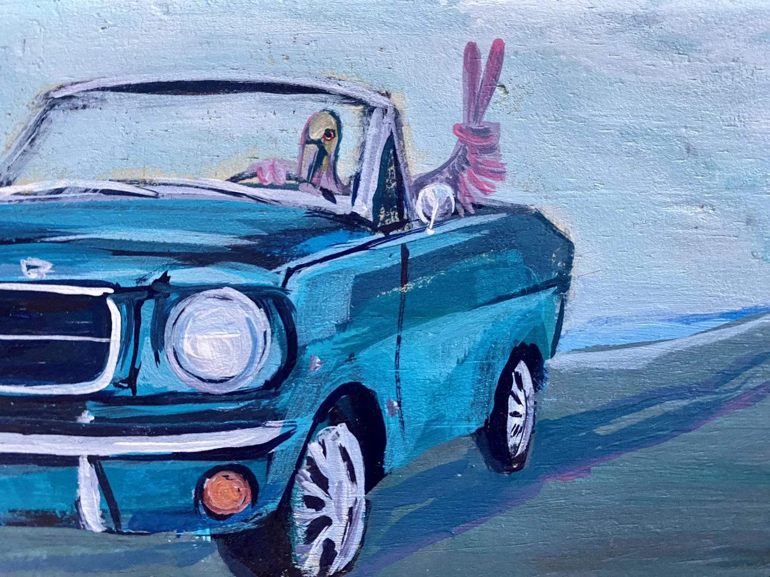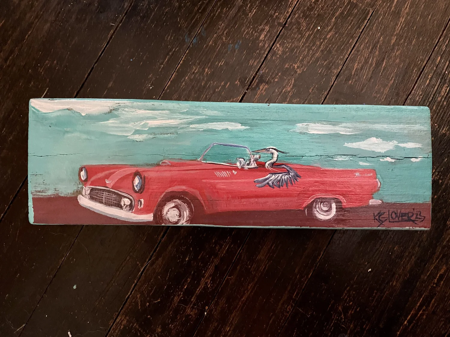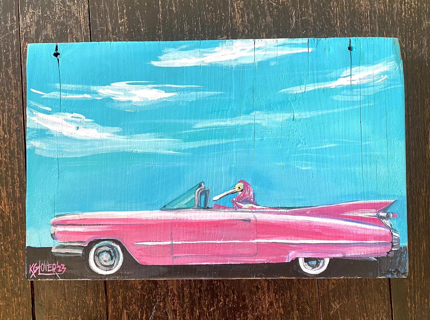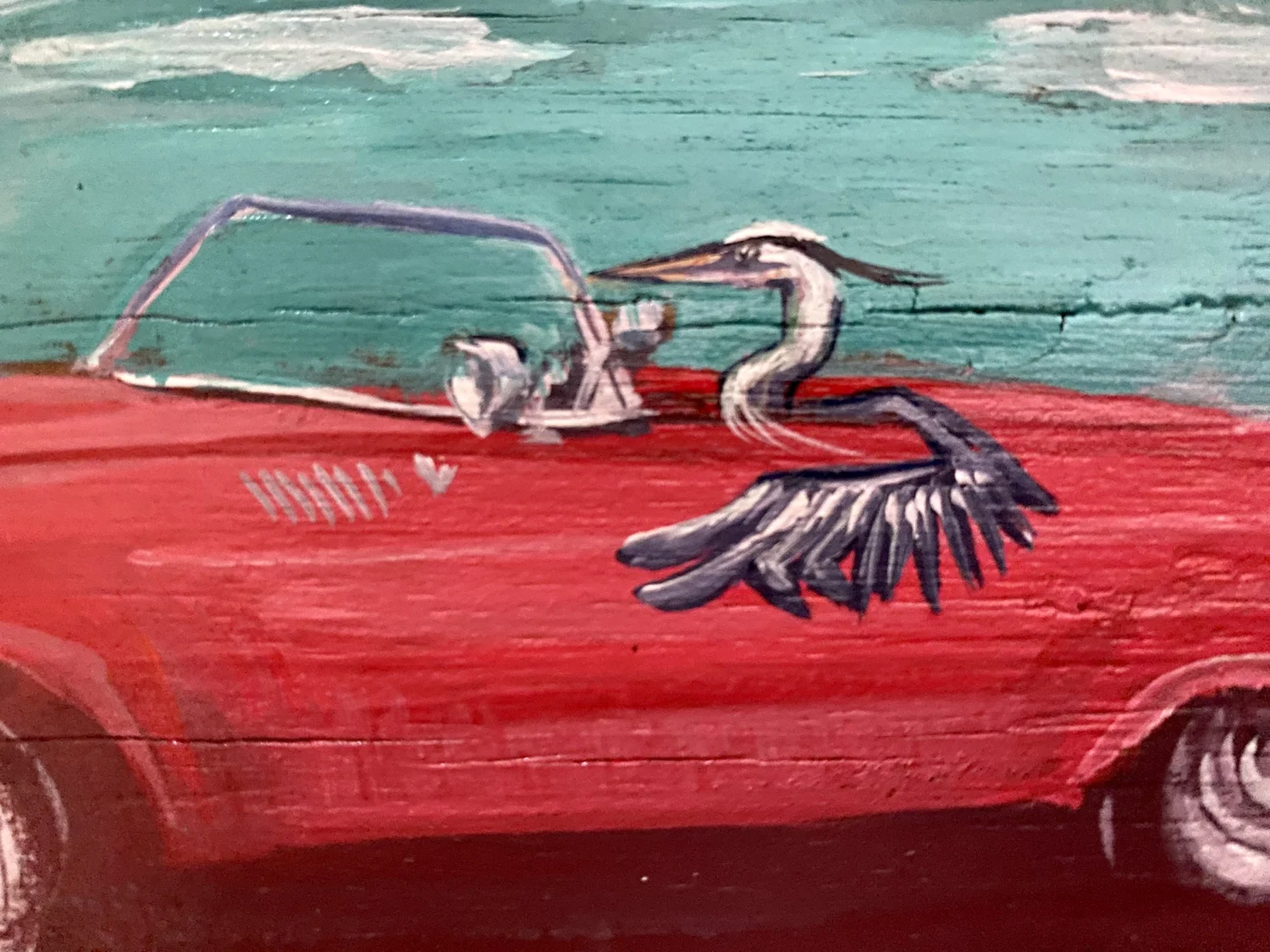 I LOVE being outdoors and seeing all the different plants and animals. Living on the Texas Coast we get to see lots of different coastal birds like pelicans, herons, egrets, spoonbills, and so many more! I’ve studied and painted these coastal birds for at least a decade now. What carelessness they have in their day to day life compared to humans; just flying around and eating in the great outdoors, looking so pretty. What if they had to get around like humans? Driving, working, entertaining themselves with activities and hobbies, possessing things, buying things.. What if a pink roseate spoonbill was driving that pretty cherry red Bel Air that I’ve been seeing? The thought made me laugh, so I decided to paint it just to see. This series began with “Spoonbill in a Bel Air” in late winter of 2023 and is ongoing.