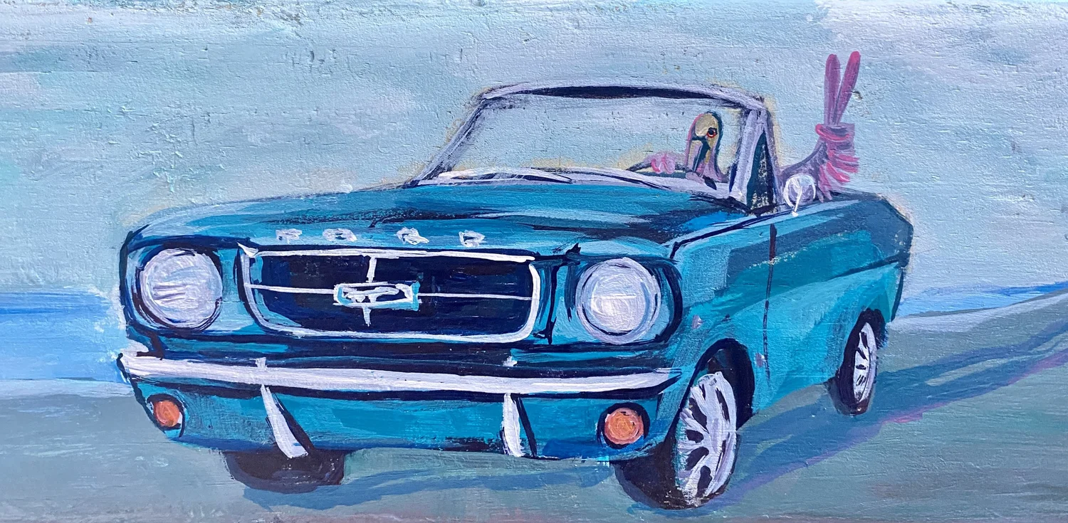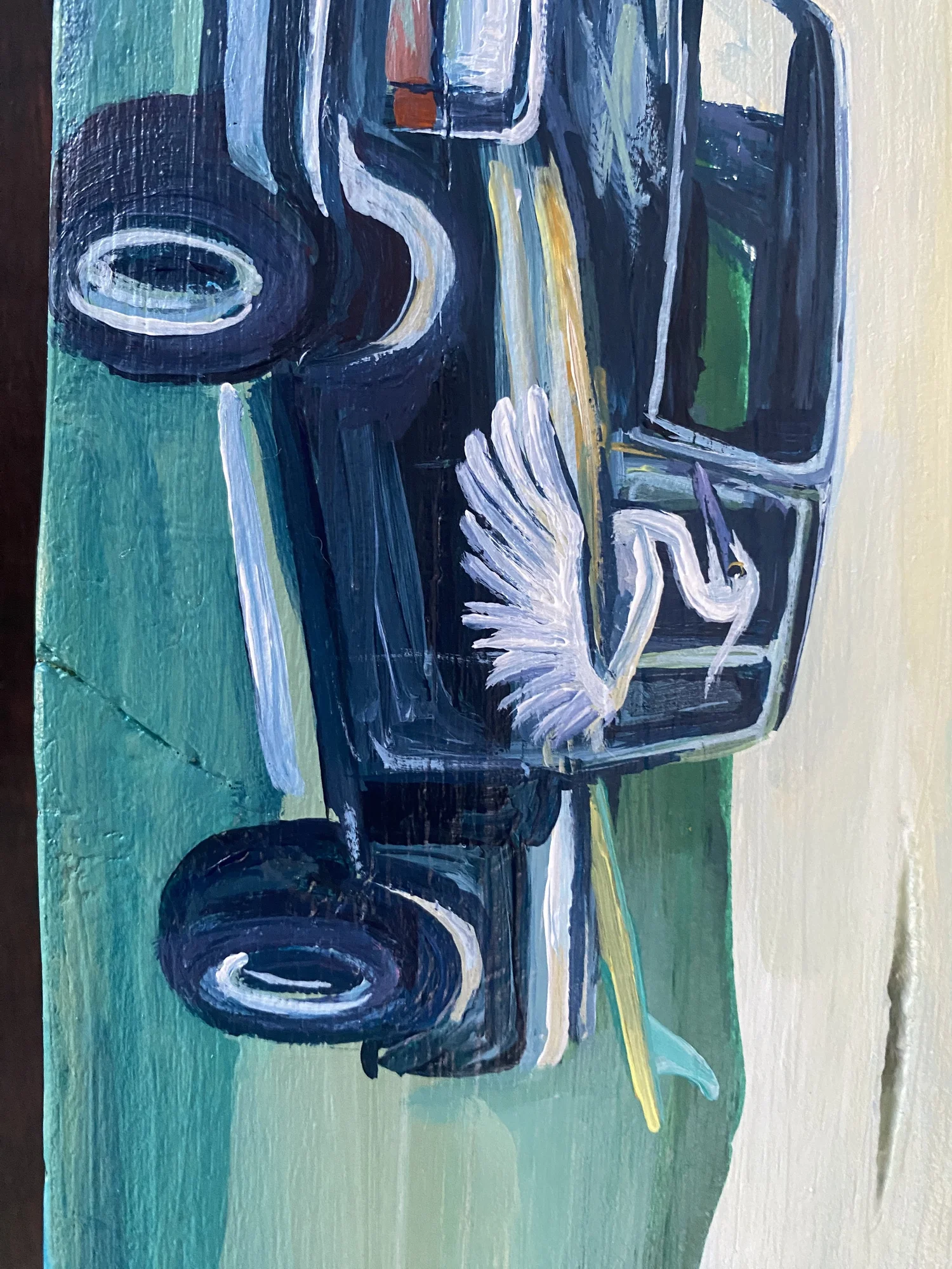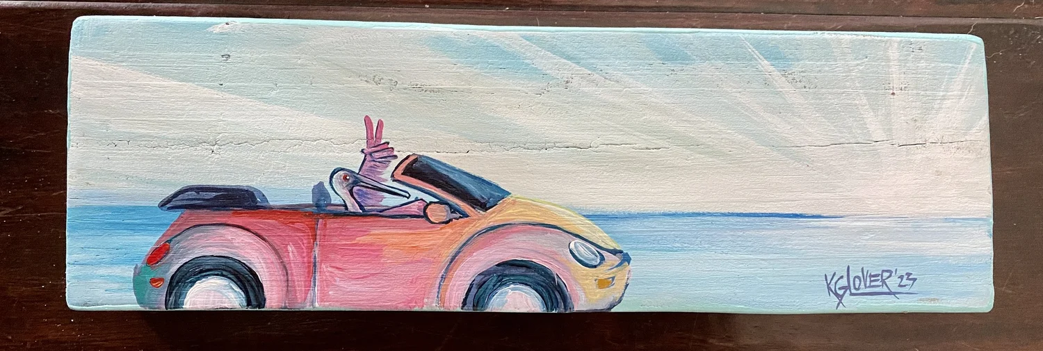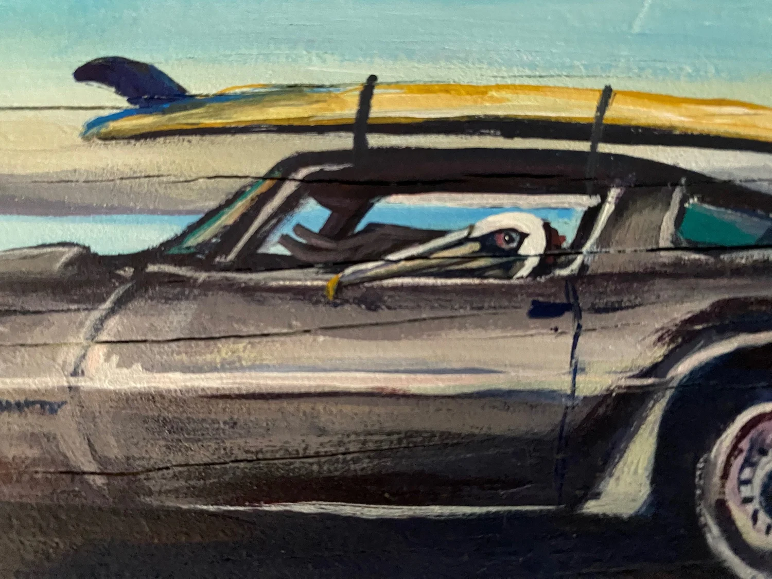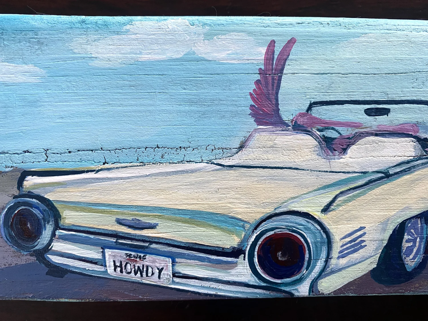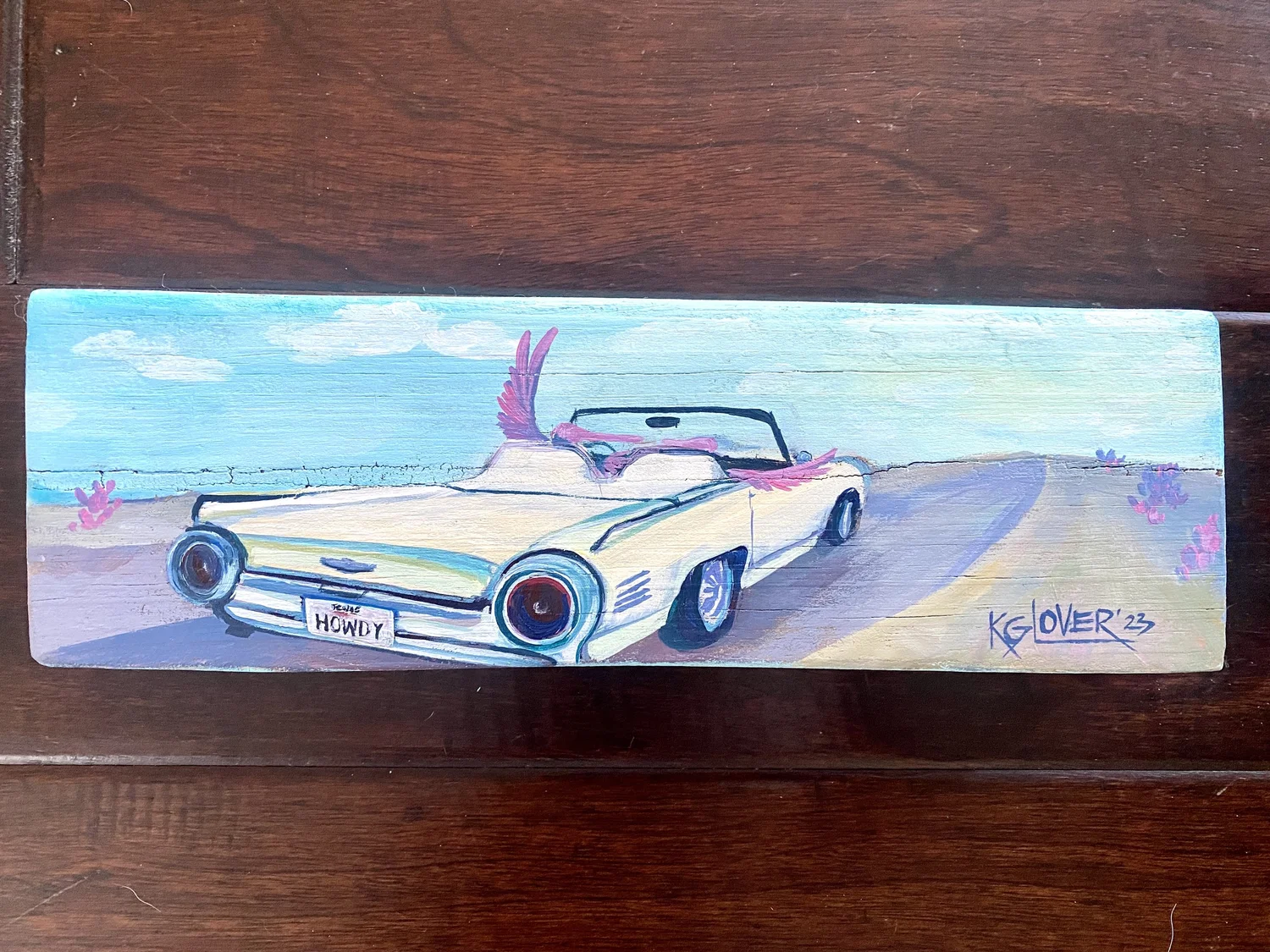 I LOVE being outdoors and seeing all the different plants and animals. Living on the Texas Coast we get to see lots of different coastal birds like pelicans, herons, egrets, spoonbills, and so many more! I’ve studied and painted these coastal birds for at least a decade now. What carelessness they have in their day to day life compared to humans; just flying around and eating in the great outdoors, looking so pretty. What if they had to get around like humans? Driving, working, entertaining themselves with activities and hobbies, possessing things, buying things.. What if a pink roseate spoonbill was driving that pretty cherry red Bel Air that I’ve been seeing? The thought made me laugh, so I decided to paint it just to see. This series began with “Spoonbill in a Bel Air” in late winter of 2023 and is ongoing.