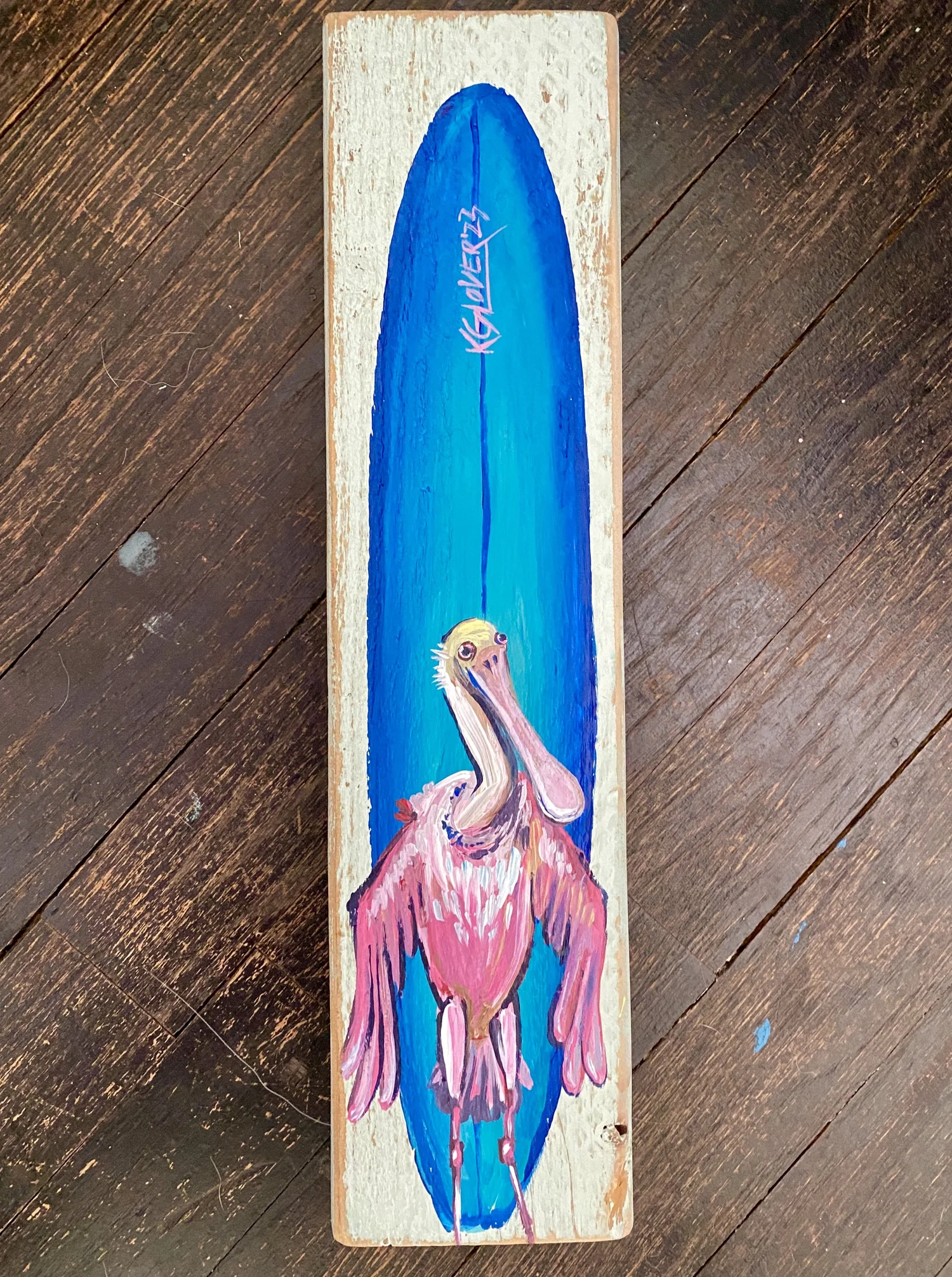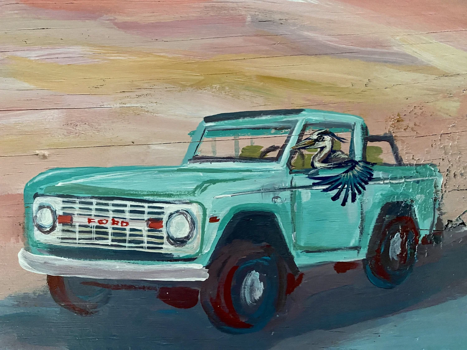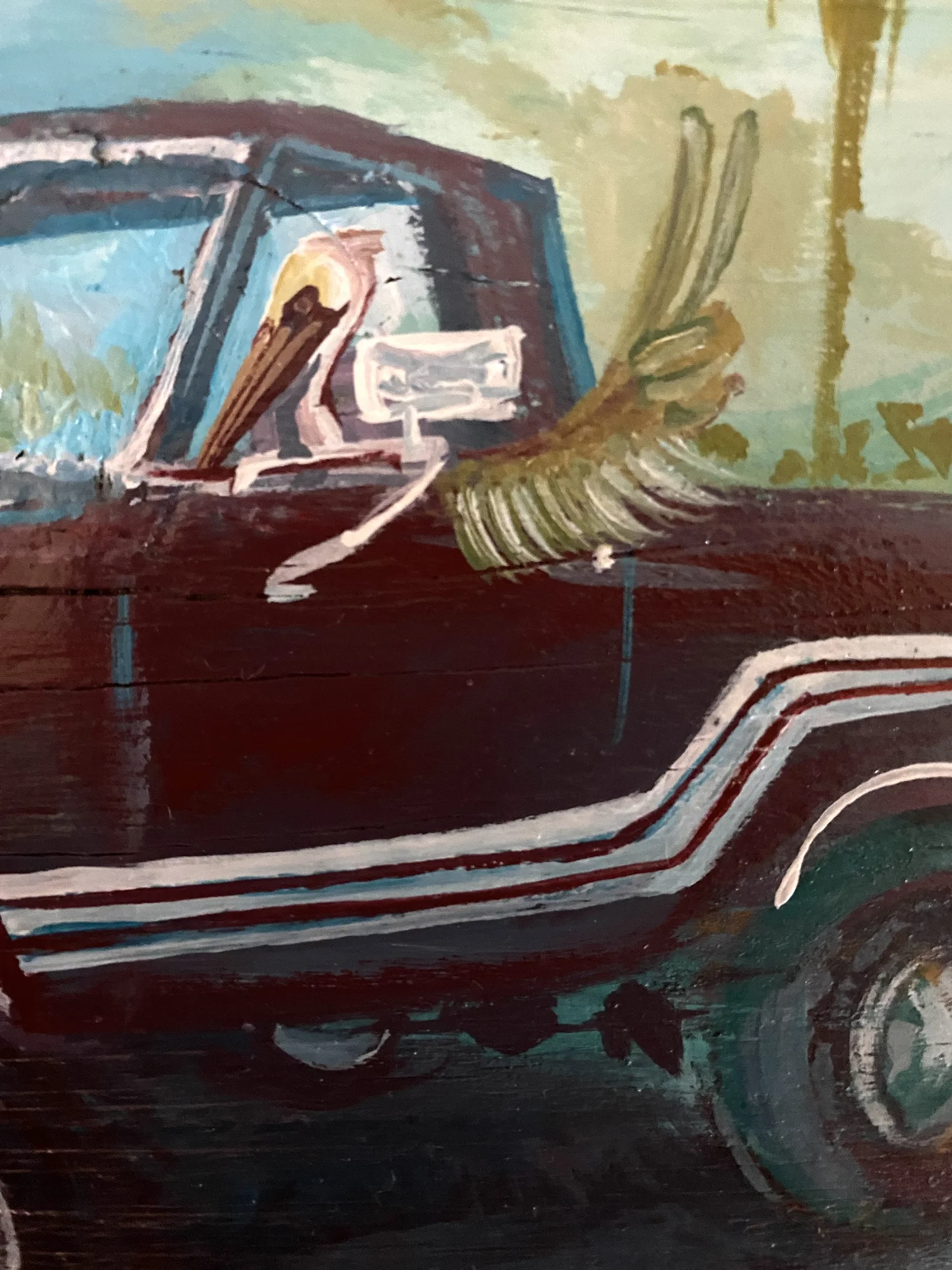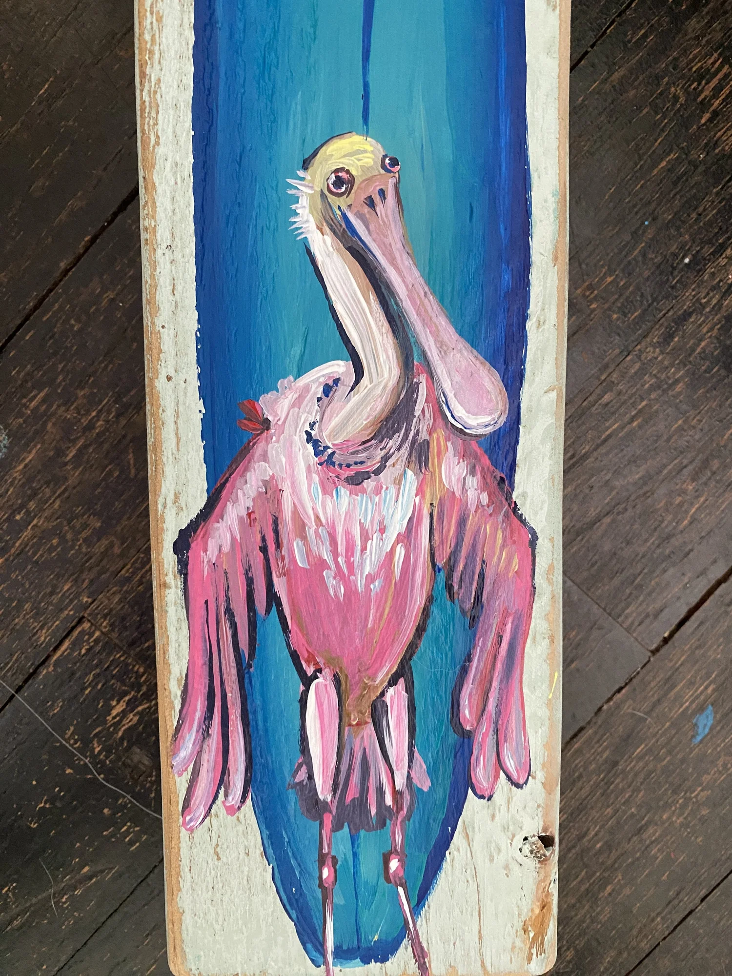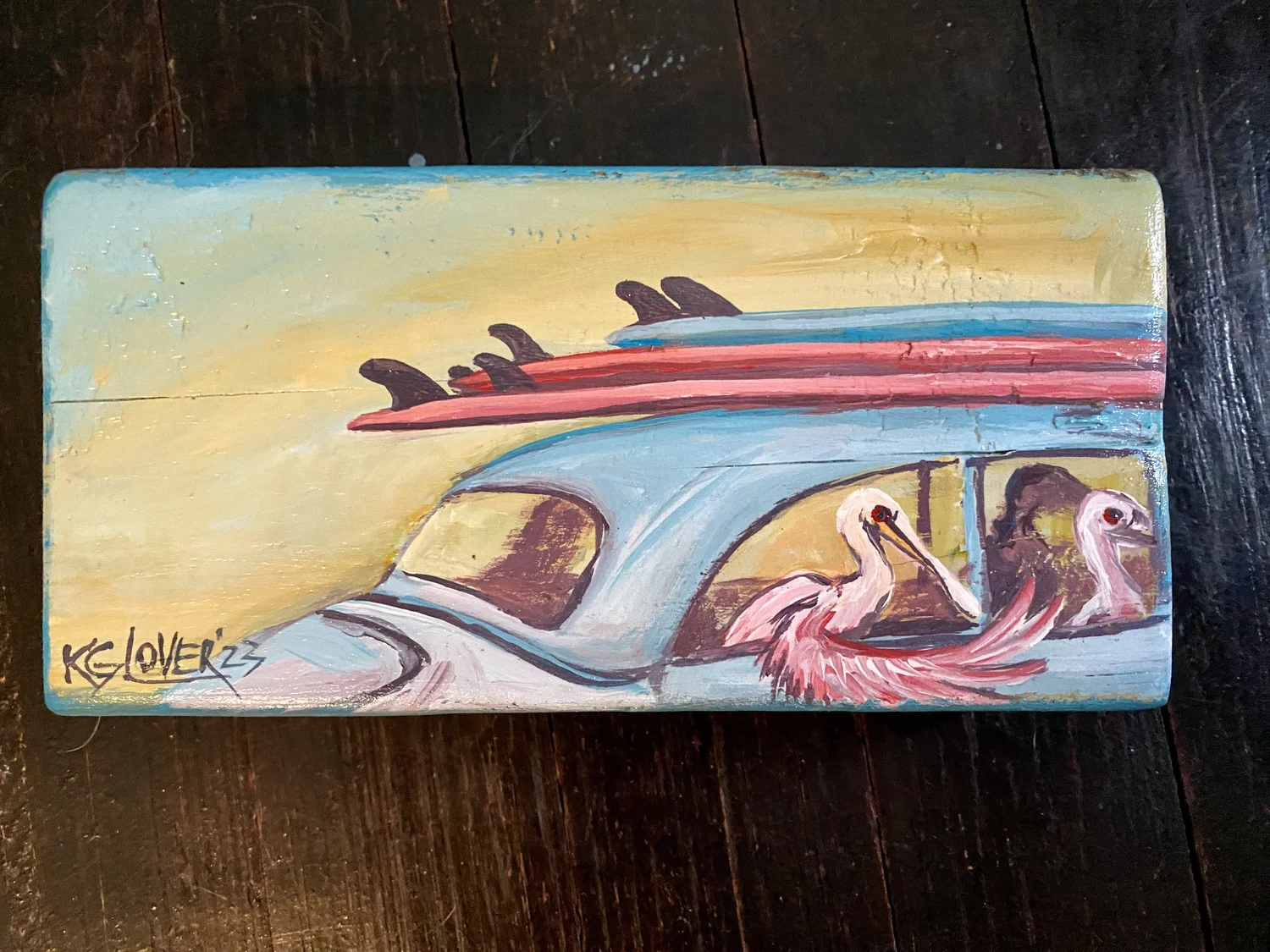 I LOVE being outdoors and seeing all the different plants and animals. Living on the Texas Coast we get to see lots of different coastal birds like pelicans, herons, egrets, spoonbills, and so many more! I’ve studied and painted these coastal birds for at least a decade now. What carelessness they have in their day to day life compared to humans; just flying around and eating in the great outdoors, looking so pretty. What if they had to get around like humans? Driving, working, entertaining themselves with activities and hobbies, possessing things, buying things.. What if a pink roseate spoonbill was driving that pretty cherry red Bel Air that I’ve been seeing? The thought made me laugh, so I decided to paint it just to see. This series began with “Spoonbill in a Bel Air” in late winter of 2023 and is ongoing.