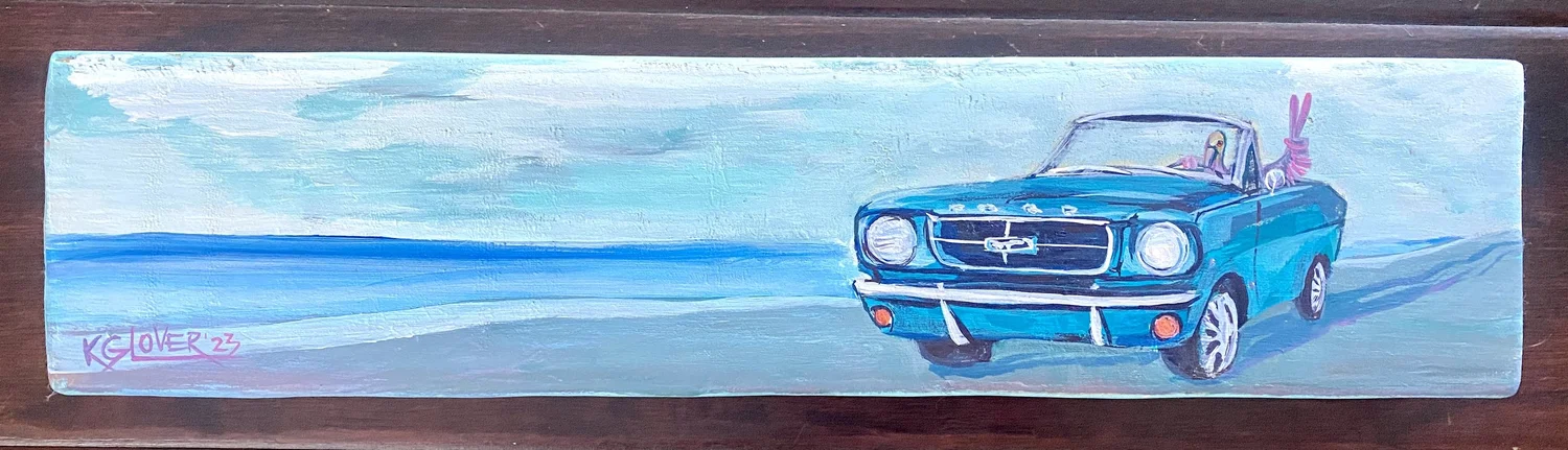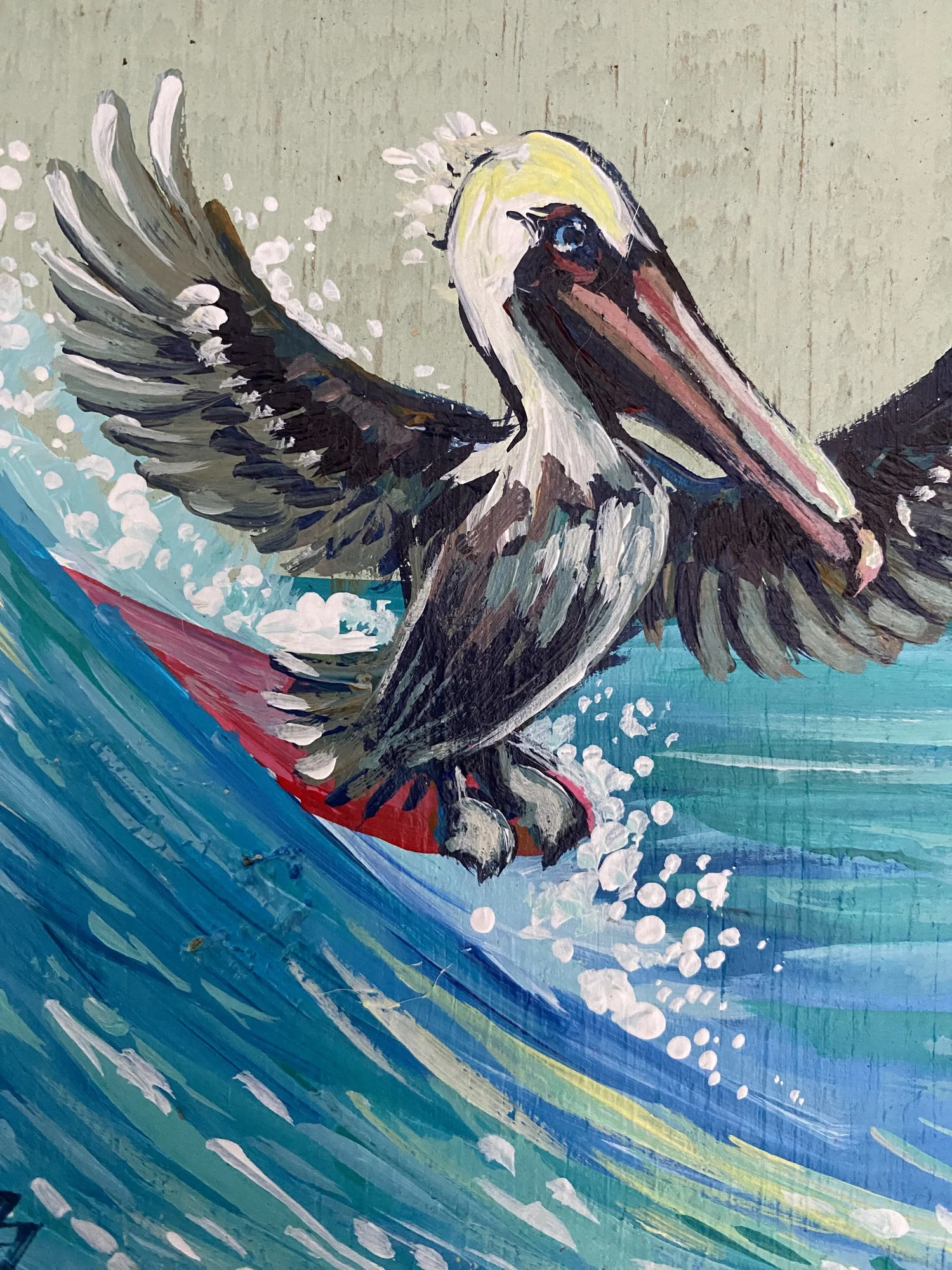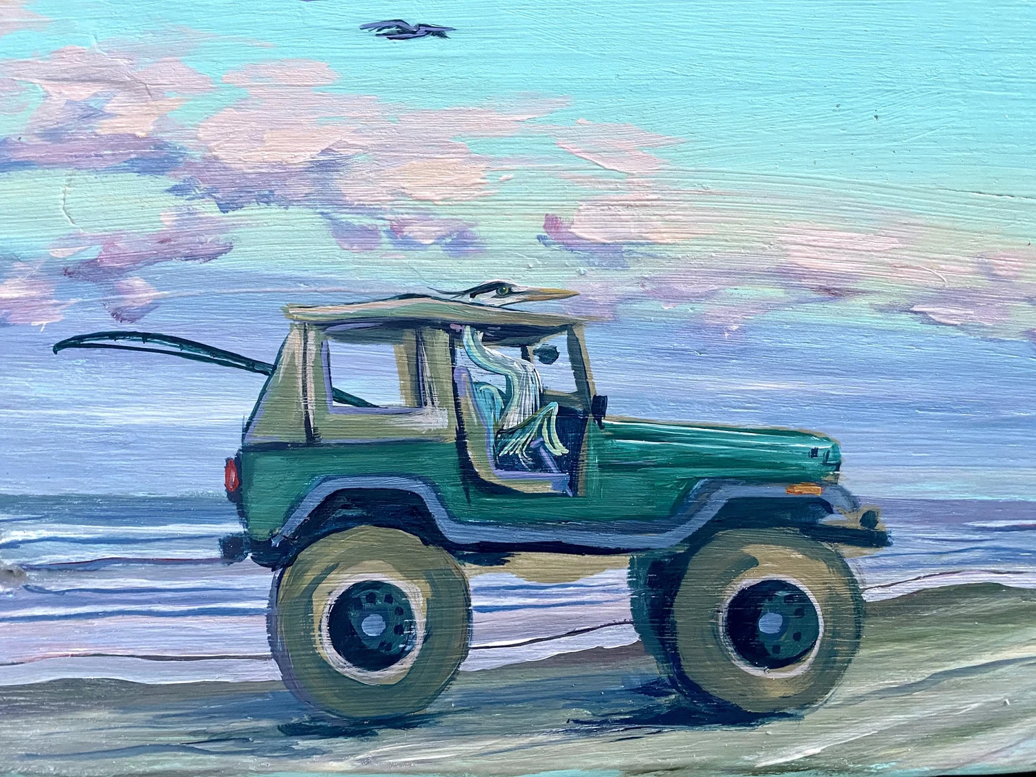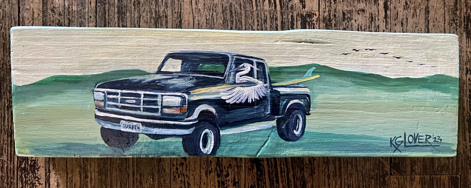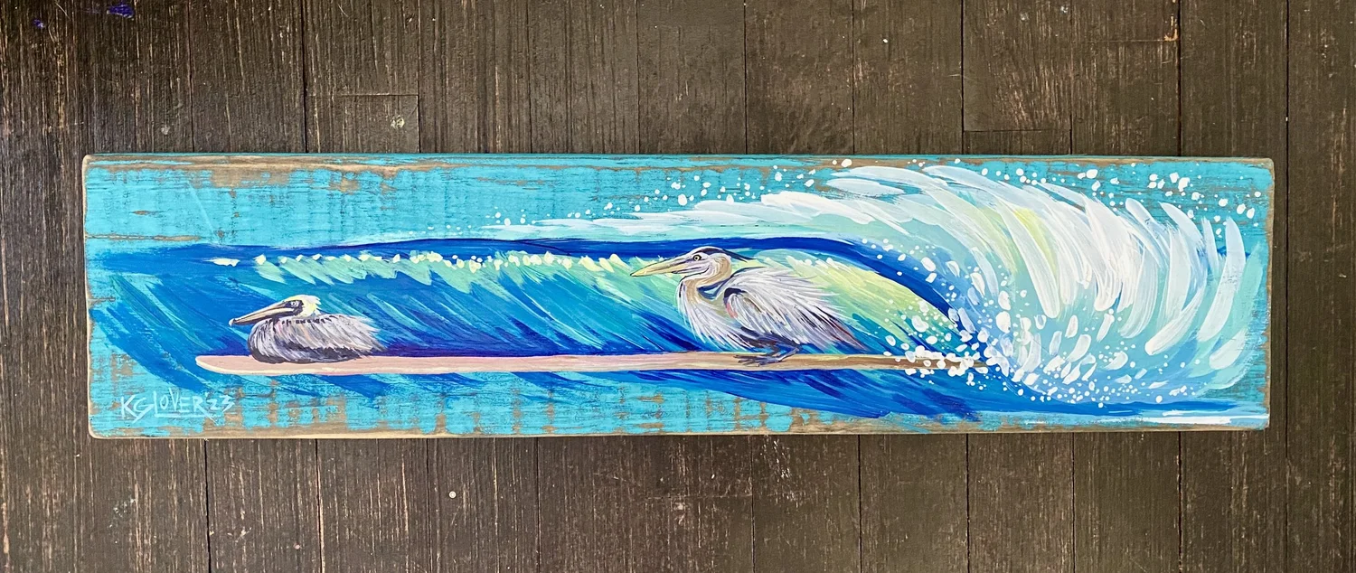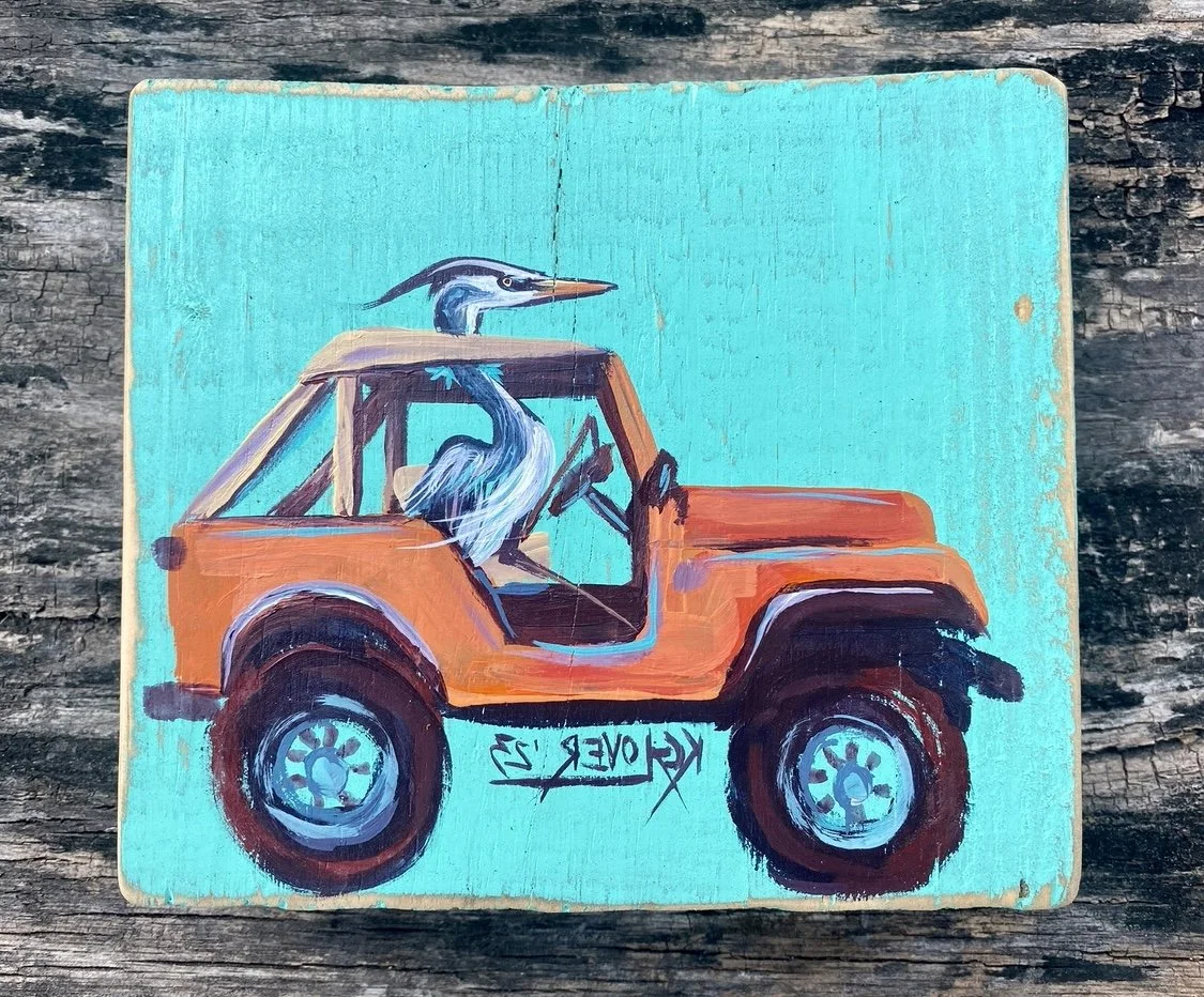 I LOVE being outdoors and seeing all the different plants and animals. Living on the Texas Coast we get to see lots of different coastal birds like pelicans, herons, egrets, spoonbills, and so many more! I’ve studied and painted these coastal birds for at least a decade now. What carelessness they have in their day to day life compared to humans; just flying around and eating in the great outdoors, looking so pretty. What if they had to get around like humans? Driving, working, entertaining themselves with activities and hobbies, possessing things, buying things.. What if a pink roseate spoonbill was driving that pretty cherry red Bel Air that I’ve been seeing? The thought made me laugh, so I decided to paint it just to see. This series began with “Spoonbill in a Bel Air” in late winter of 2023 and is ongoing.